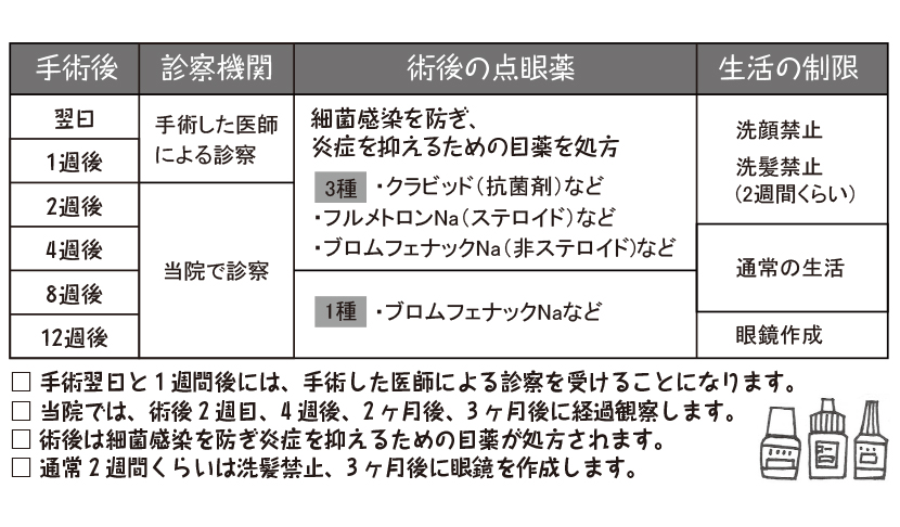 手術後の養生が悪いと雑菌が傷口から侵入して、せっかく見えるようになった目を台無しにする危険性もあるため、手術後の養生と3 ヶ月間の経過観察は必要です。およその目安は以下の通り。